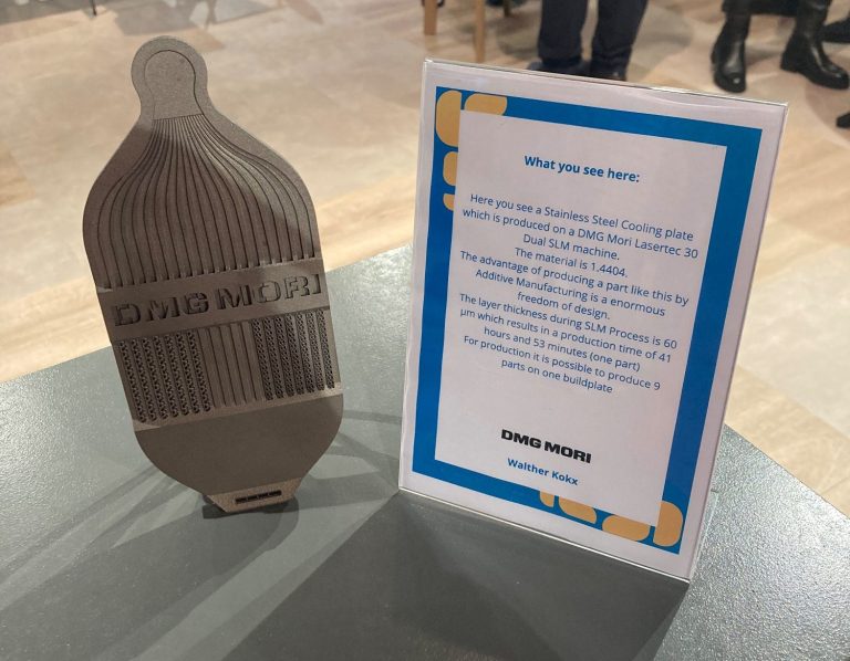 Hier ziet u een roestvrijstalen koelplaat die geproduceerd is op een DMG Mori Lasertec 30 Dual SLM-machine.