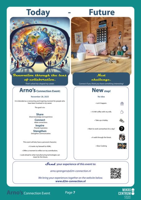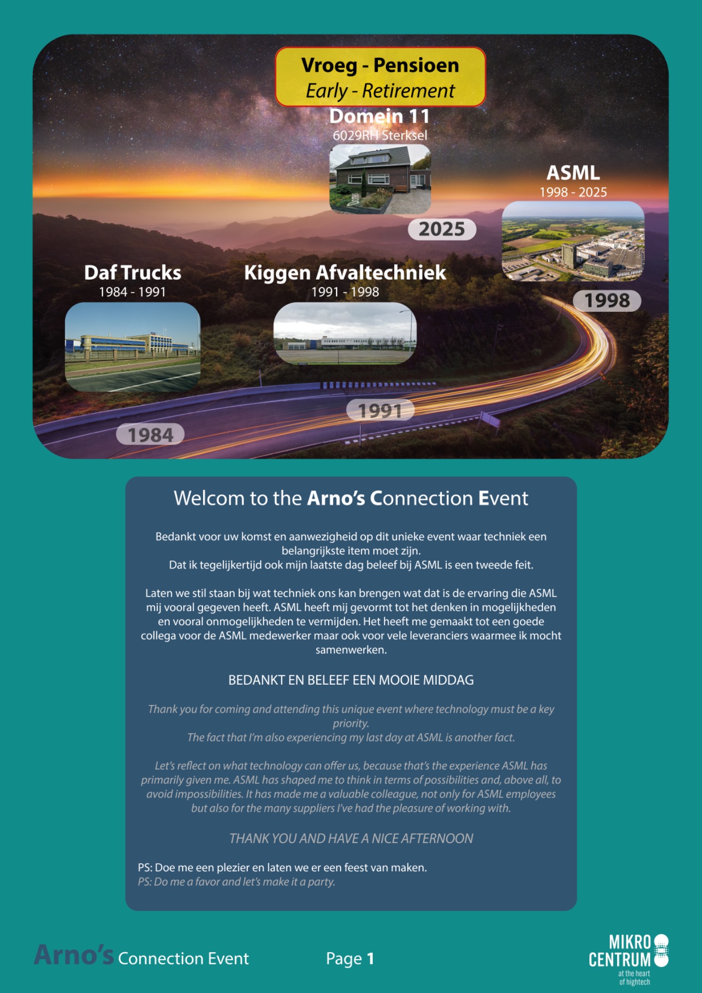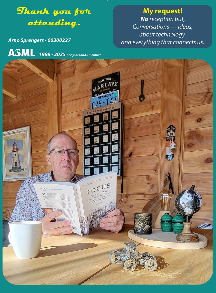 D-day, mijn laatste dag bij ASML en een nieuw begin van iets wat ik samen met mijn vrouw ga beleven. Maar de techniek is zo mooi dat ik die waarschijnlijk niet zal gaan verlaten. Hoe ik nog betrokken zal gaan zijn wordt een onderzoek, een ding is zeker ik moet er energie van krijgen.