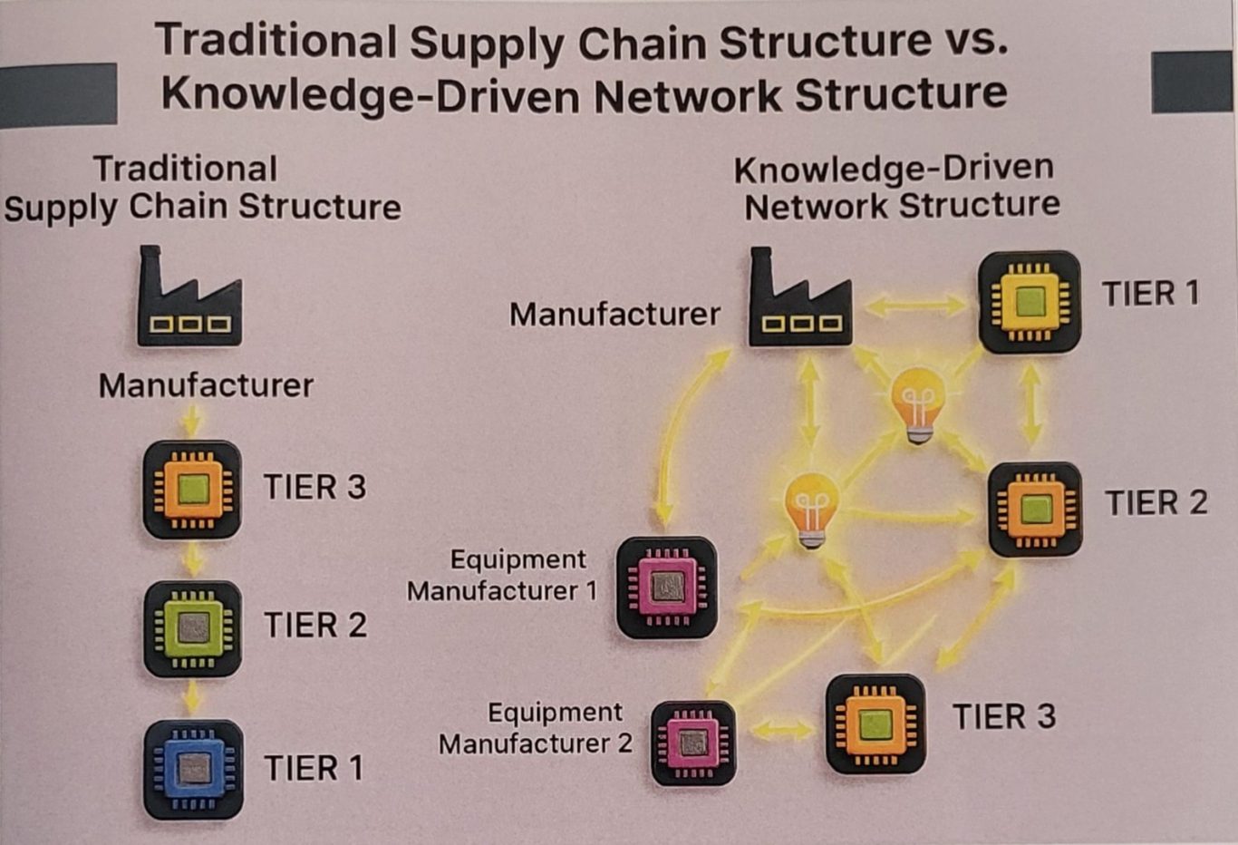 In supply chain management werkt men al decennialang volgens het concept van N-tier. De 1.-tier is de spil en neemt de verantwoordelijkheid op zich, ook voor de toeleveranciers verderop in de keten. Arno Sprengers: "Dit heeft de ASML machine vorm gegeven en heeft zeker bijgedragen aan de groei die we hebben doorgemaakt, maar we weten ook dat wat goed is beter moet; dat we de lat nog eens hoger leggen. Vandaar dat de tijd rijp is voor een paradigmaverandering." De 1.-tier supplier kan niet meer alle hoogstaande technologieën en kennis in huis hebben die hightech OEMS vandaag de dag nodig hebben. "Daarvoor hebben ze de rest van de keten nodig." Juist omdat er tegenwoordig op de grens van het maakbare wordt gewerkt, volstaat het oude concept niet meer waarin de 1.-tier supplier de regierol vervult. "In een tijd waarin organisaties niet langer volledig zelfvoorzienend zijn, is samenwerking essentieel. Dit vraagt om het organiseren van kennisoverdracht vanaf de start van een ontwerp heeft in deze netwerkstructuur bestaansrecht." Leveranciers moeten hun interne kennisorganisatie versterken en zich strategisch positioneren. Hij realiseert zich dat het werken in dergelijke structuren niet eenvoudig is. De belangen zijn immers niet altijd gelijk. Maar alleen als de ketens op basis van gelijkwaardigheid gaan samenwerken, komt men als totaal verder. "We moeten toeleveranciers het gevoel geven dat ze